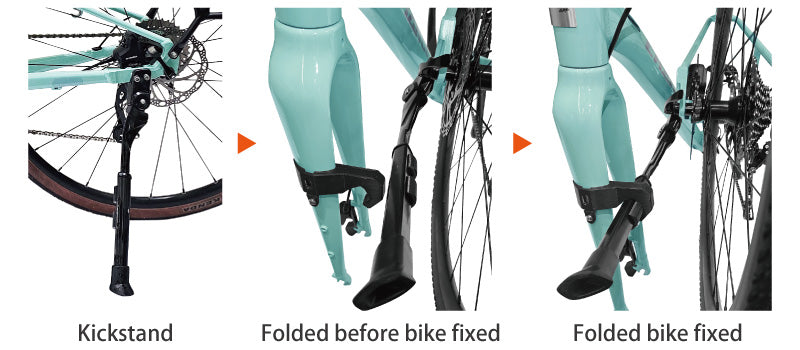 - By hooking the pushing hook on the front fork to the kickstand, the folded bike can be securely fixed.